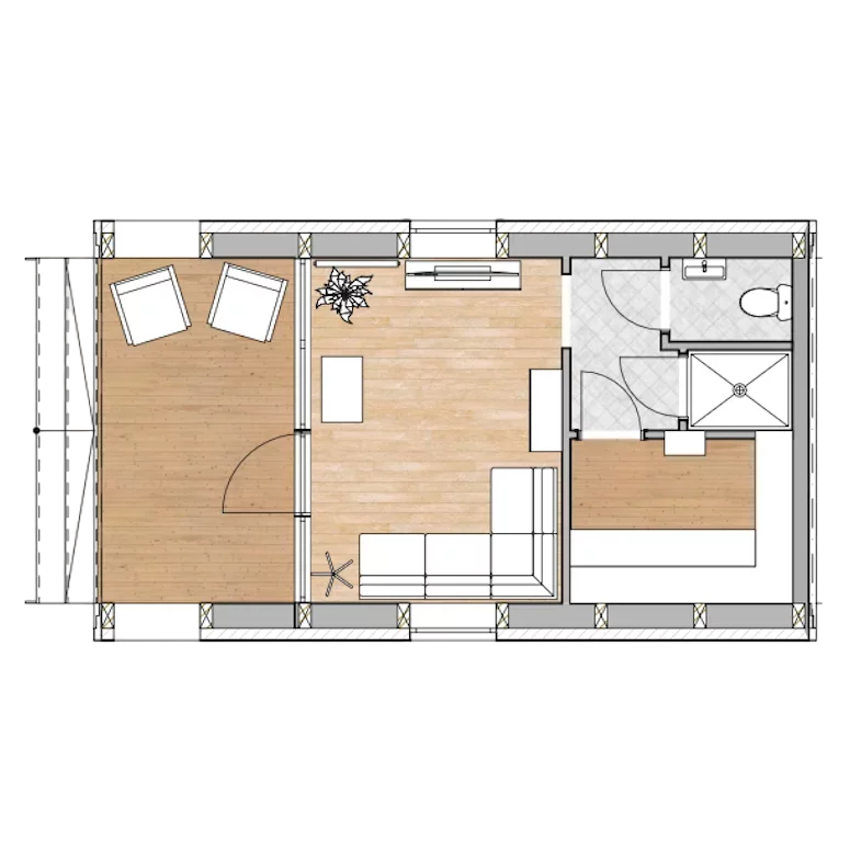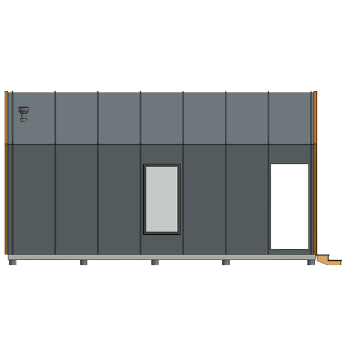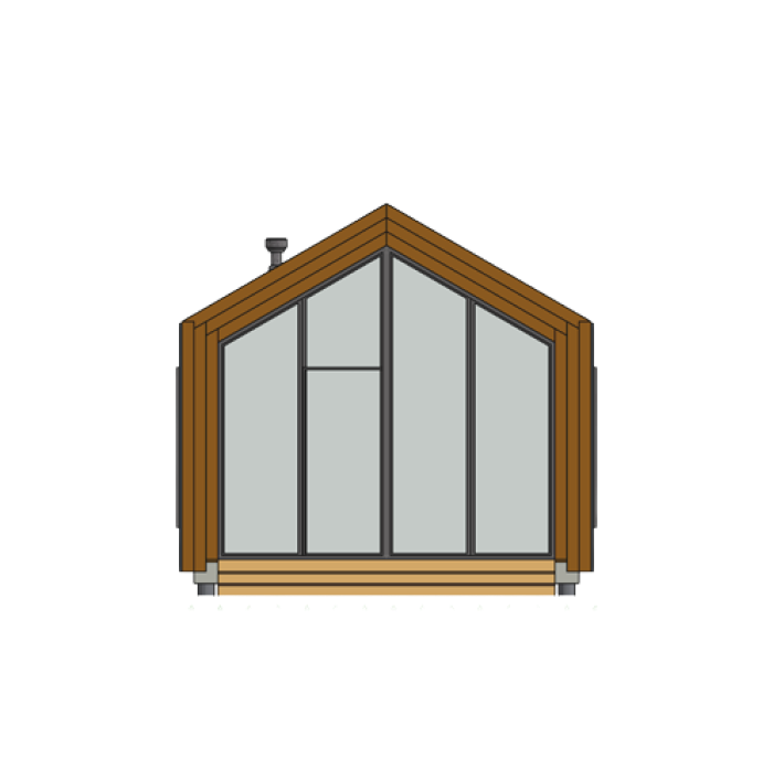 Баня, площадью 35 м2 с террасой – это готовая сборная конструкция общей длинной 8,4 м, шириной 4,2 м и высотой в коньке 4,44 м. Проектный тип фундамента под баню – свайно-винтовой
