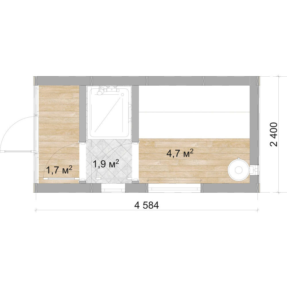Баня, площадью 8 м2 – это готовая сборная конструкция общей длинной 4,5 м, шириной 2,4 м.