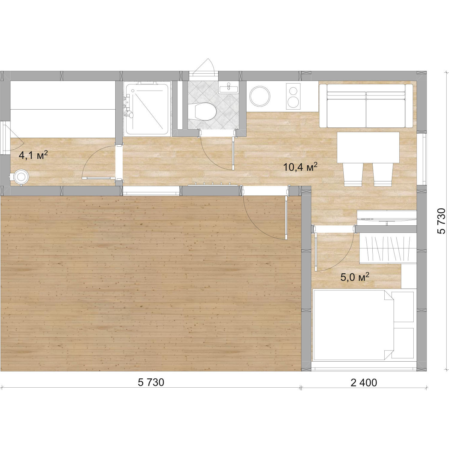 Баня, площадью 35 м2 с террасой – это готовая сборная конструкция общей длинной 8,1 м, шириной 5,7 м.