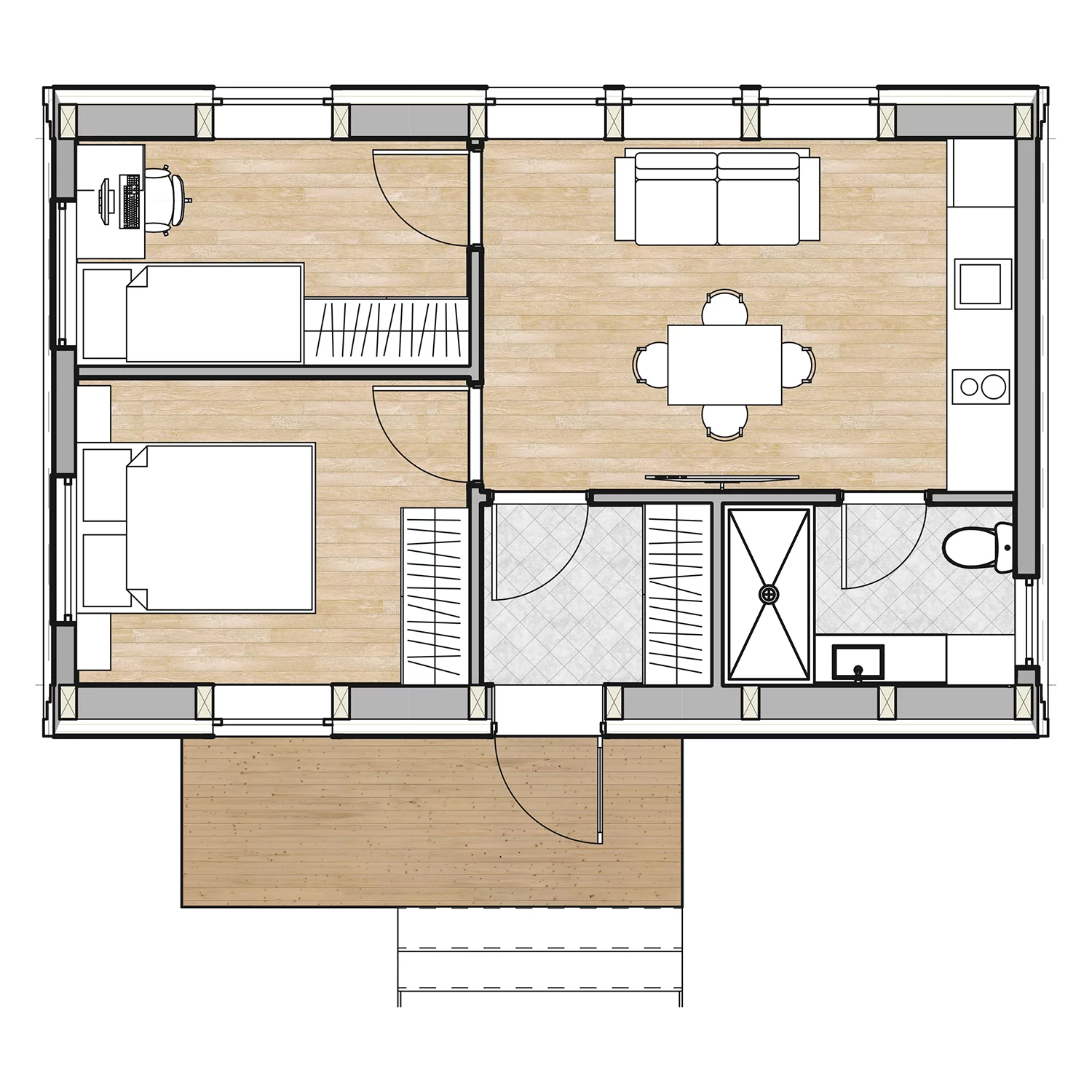 Модульный дом, площадью 38 м2 – это готовая сборная конструкция общей длинной 8,25 метра, шириной 4,8 метра и высотой в коньке 4,44 метра.