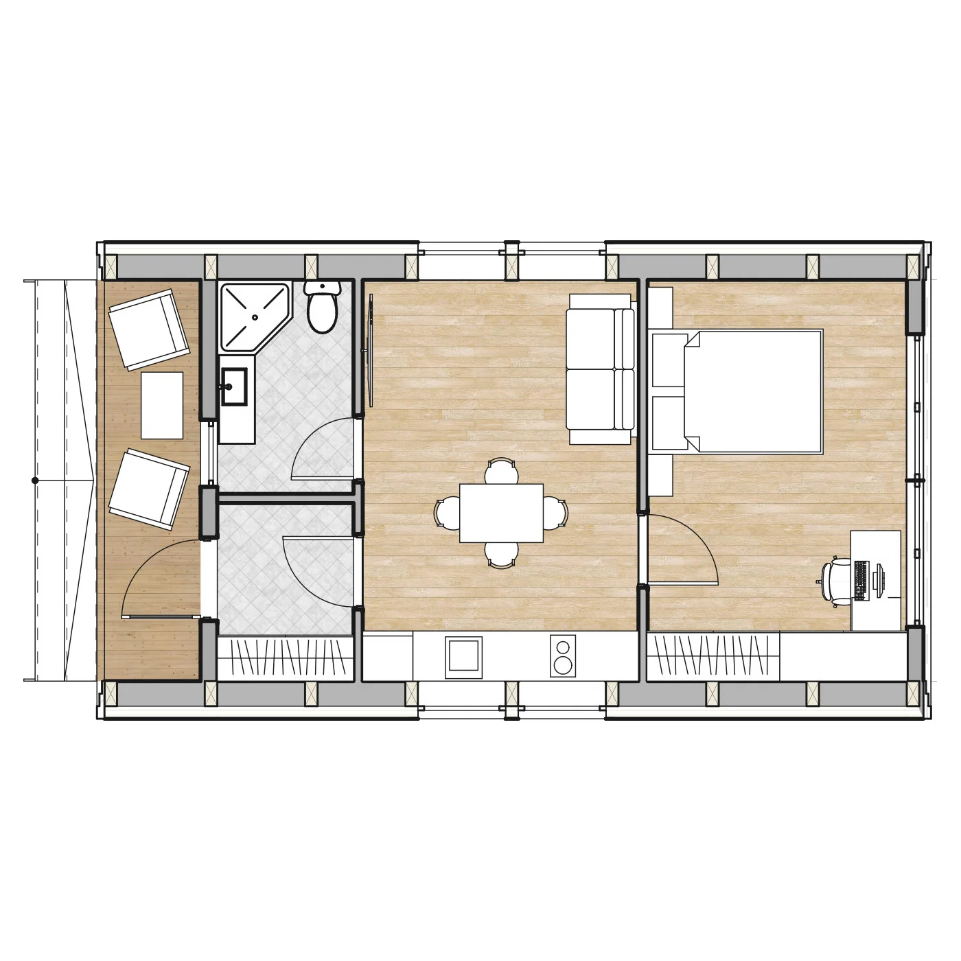 Модульный дом, площадью 38,3 м2 – это готовая сборная конструкция общей длинной 9,6 м, шириной 5,1 м и высотой в коньке 4,44 м.